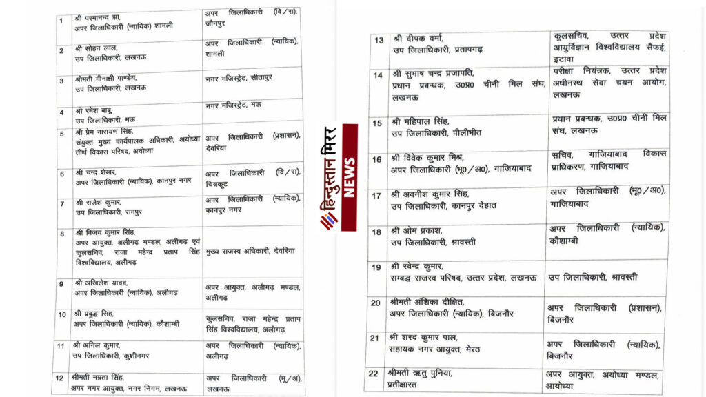 लखनऊ। उत्तर प्रदेश सरकार ने प्रशासनिक स्तर पर बड़ा फेरबदल करते हुए 22 पीसीएस (PCS) अधिकारियों के तबादले कर दिए हैं। यह तबादले राज्य में प्रशासनिक कार्यों को अधिक प्रभावी और सुचारु बनाने के उद्देश्य से किए गए हैं। नियुक्ति एवं कार्मिक विभाग द्वारा जारी आदेश के अनुसार, कई अधिकारियों को वर्तमान तैनाती से हटाकर नई जिम्मेदारियां सौंपी गई हैं, जबकि कुछ को महत्वपूर्ण जिलों और विभागों में भेजा गया है।