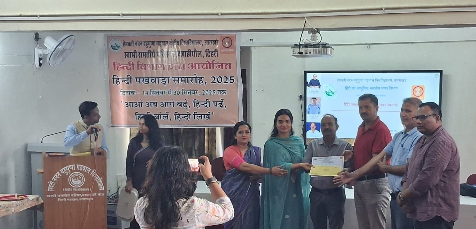 हेमवती नंदन बहुगुणा गढ़वाल केंद्रीय विश्वविद्यालय, बादशाहीथौल, टिहरी के हिन्दी विभाग द्वारा आयोजित हिंदी पखवाड़ा समापन समारोह का आयोजन बड़ी ही गरिमा और उत्साह के साथ किया गया। समारोह में विश्वविद्यालय के उप अधिष्ठाता छात्र कल्याण प्रो. जेडीएस नेगी ने मुख्य अतिथि के रूप में अपने विचार व्यक्त करते हुए कहा कि हिंदी को संपूर्ण भारत में लोकप्रिय बनाने के लिए हमें झिझक छोड़नी होगी और इसे आत्मविश्वास के साथ अपनाना चाहिए। उन्होंने दक्षिण भारत में हिंदी को संपर्क भाषा के रूप में बढ़ावा देने की आवश्यकता पर बल दिया।
