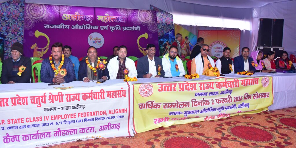 उ०प्र० राज्य कर्मचारी महासंघ जनपद शाखा अलीगढ़ का वार्षिक सम्मेलन दिनांक 02 फरवरी 2026, सोमवार को दोपहर 02:00 बजे से राजकीय कृषि एवं औद्योगिक प्रदर्शनी, अलीगढ़ स्थित मुक्ताकाम्न मंच पर आयोजित किया गया। सम्मेलन का विधिवत शुभारम्भ मुख्य अतिथि श्री योगेन्द्र कुमार, आई०ए०एस०, मुख्य विकास अधिकारी अलीगढ़ एवं अन्य विशिष्ट अतिथियों द्वारा सरस्वती वंदना के साथ किया गया। इस अवसर पर बड़ी संख्या में विभिन्न विभागों के कर्मचारी व पदाधिकारी उपस्थित रहे।