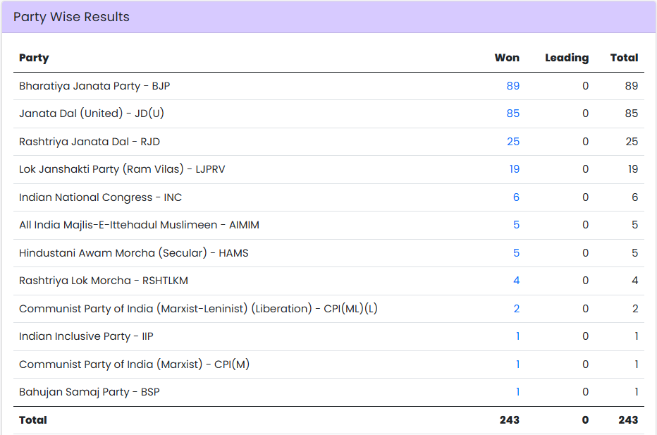 बिहार विधानसभा चुनाव 2025: एनडीए कुल 202 सीटों पर विजय ऐतिहासिक जीत, महागठबंधन हुआ धराशायी