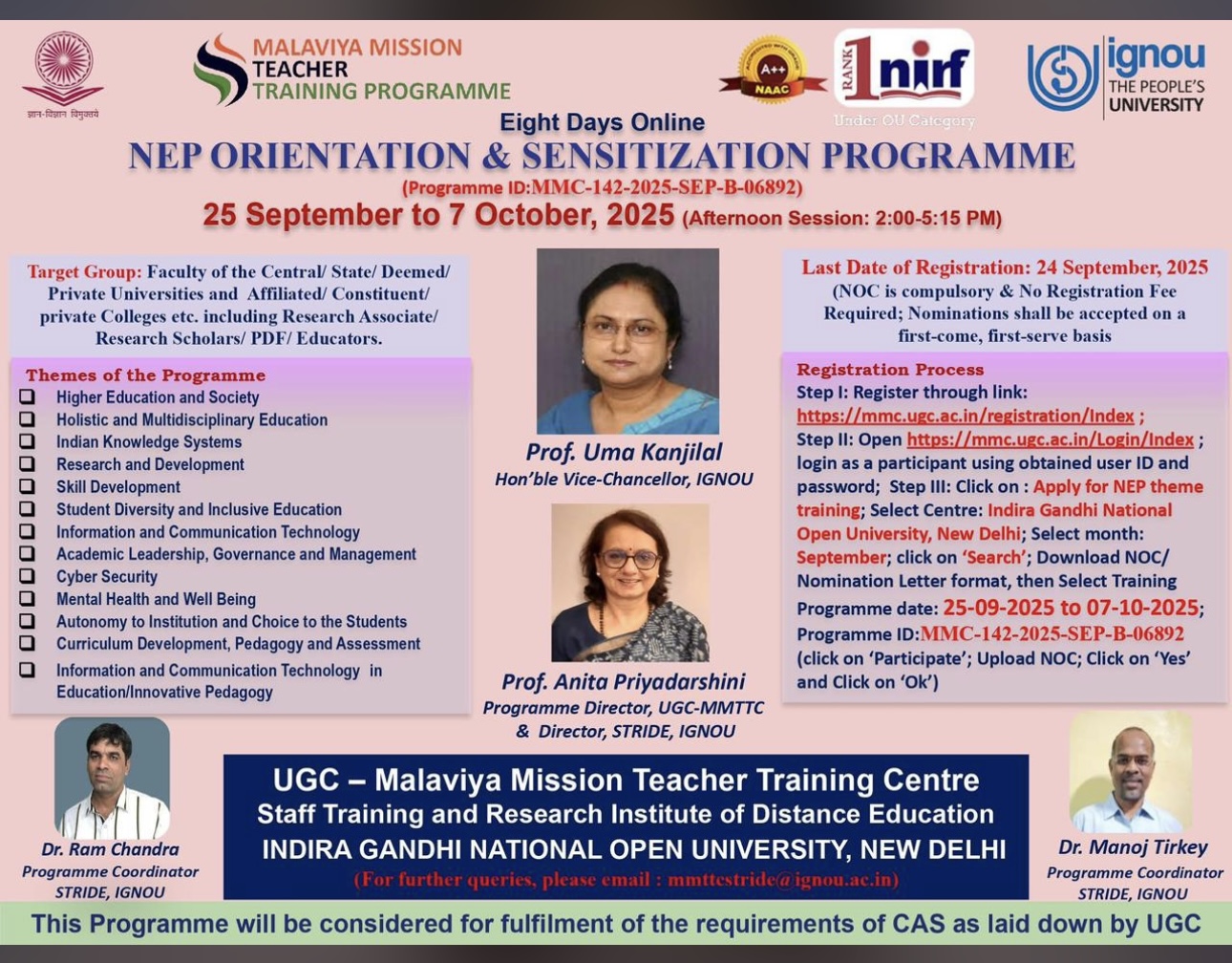 Indira Gandhi National Open University (IGNOU), under the UGC–Malaviya Mission Teacher Training Centre (MMTTC) and Staff Training & Research Institute of Distance Education (STRIDE), is set to organize an Eight-Day Online NEP Orientation & Sensitization Programme from 25th September to 7th October, 2025.