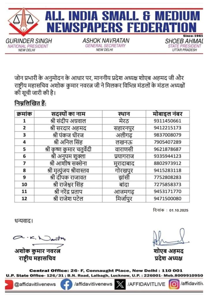 प्रदेश के अन्य मंडलों में मेरठ, सहारनपुर, लखनऊ, वाराणसी, प्रयागराज, मुरादाबाद, गोरखपुर, झांसी, बांदा, आजमगढ़ और मिर्जापुर के मंडल अध्यक्षों के नाम भी घोषित किए गए। पंकज धीरज ने अपनी नियुक्ति पर फेडरेशन के केंद्रीय और प्रांतीय नेतृत्व का आभार व्यक्त करते हुए कहा कि अलीगढ़ मंडल में शीघ्र ही फेडरेशन की पूरी कार्यकारिणी का गठन किया जाएगा।