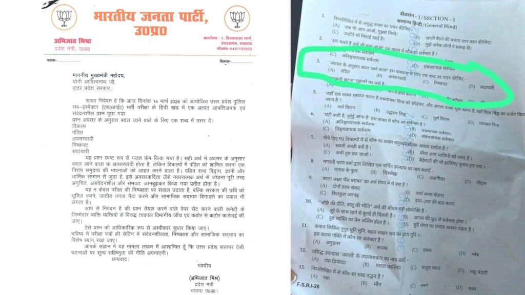 उत्तर प्रदेश पुलिस सब-इंस्पेक्टर (SI) भर्ती परीक्षा में पूछे गए एक प्रश्न और उसके विकल्पों को लेकर विवाद खड़ा हो गया है। 14 मार्च 2026 को आयोजित परीक्षा में ‘अवसर के अनुसार बदल जाने वाले’ के लिए एक शब्द पूछे जाने पर दिए गए विकल्पों में ‘पंडित’ शब्द शामिल किए जाने पर भाजपा नेताओं ने कड़ी आपत्ति जताई है। इस मामले को लेकर राजनीतिक और सामाजिक स्तर पर बहस तेज हो गई है।